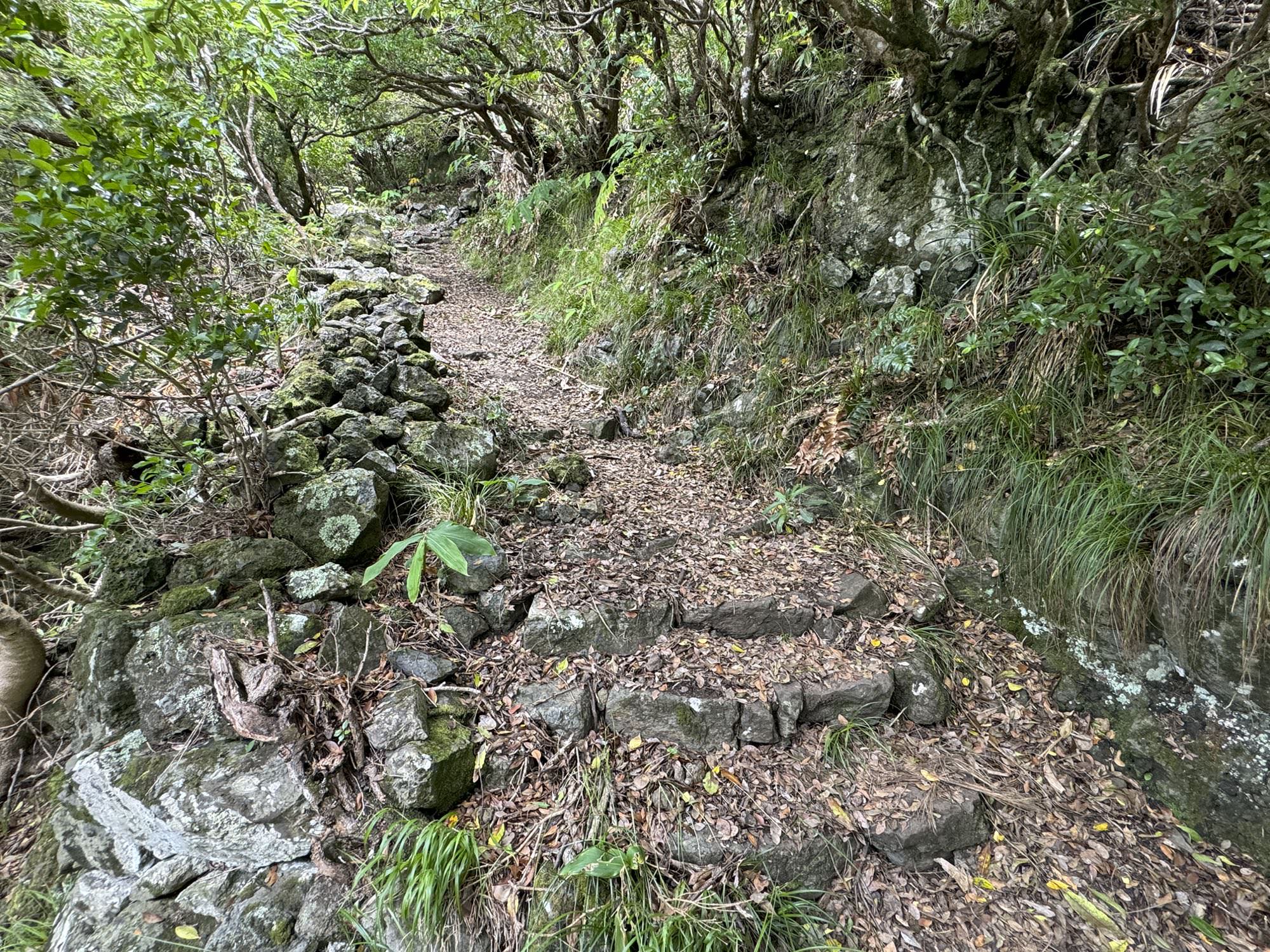 Steilabstieg auf alten Treppen durch die Felswand von Fajã Grande