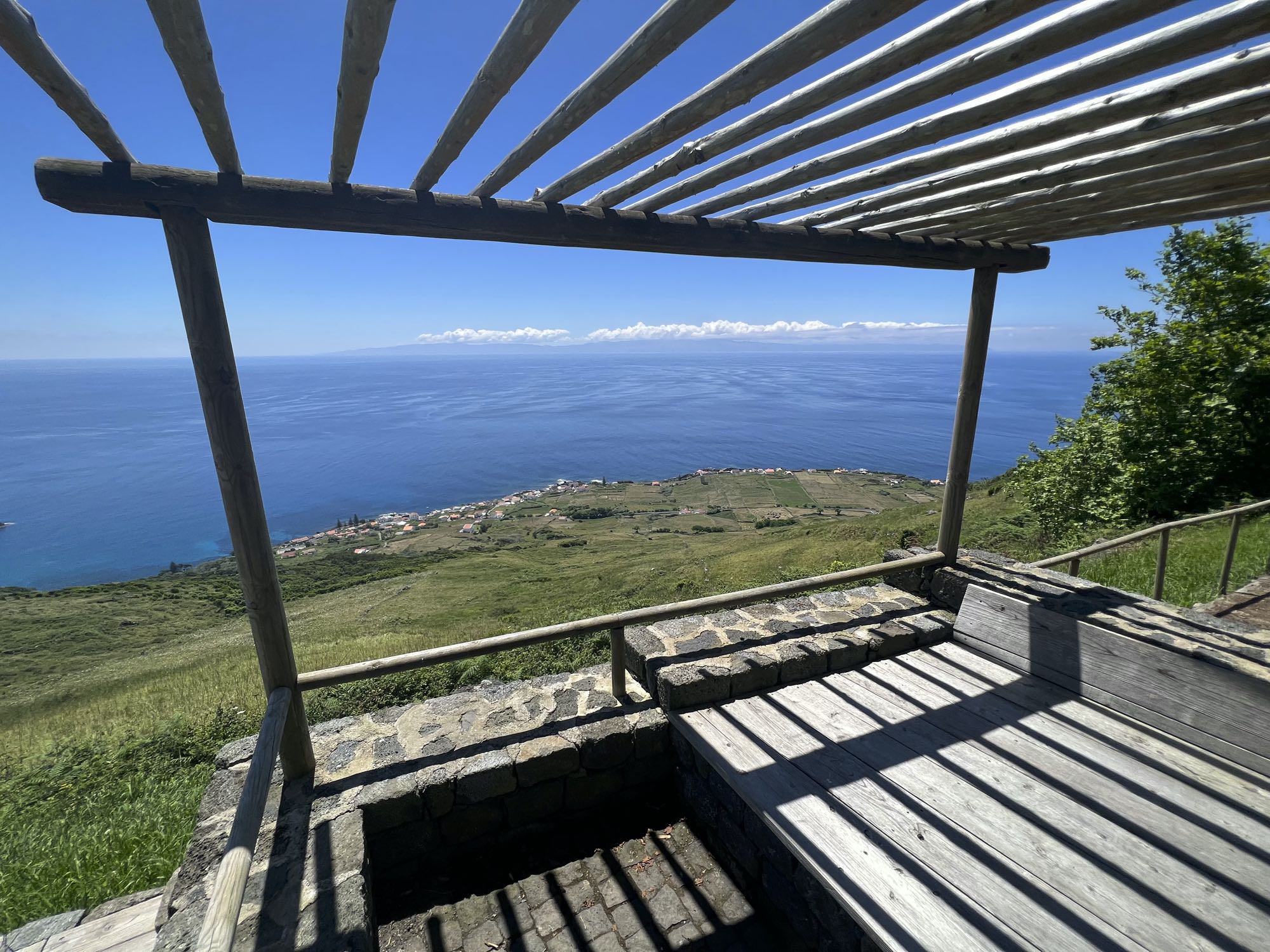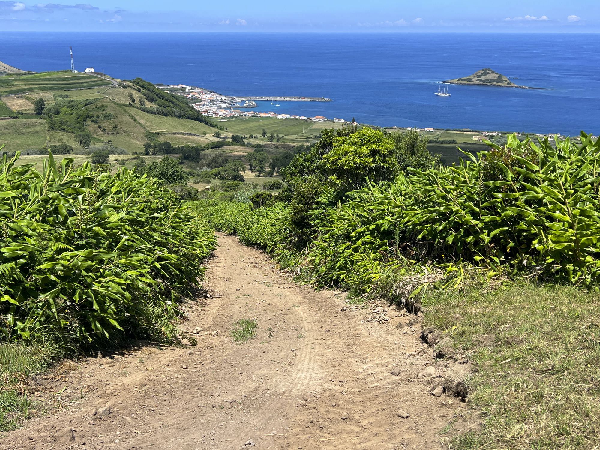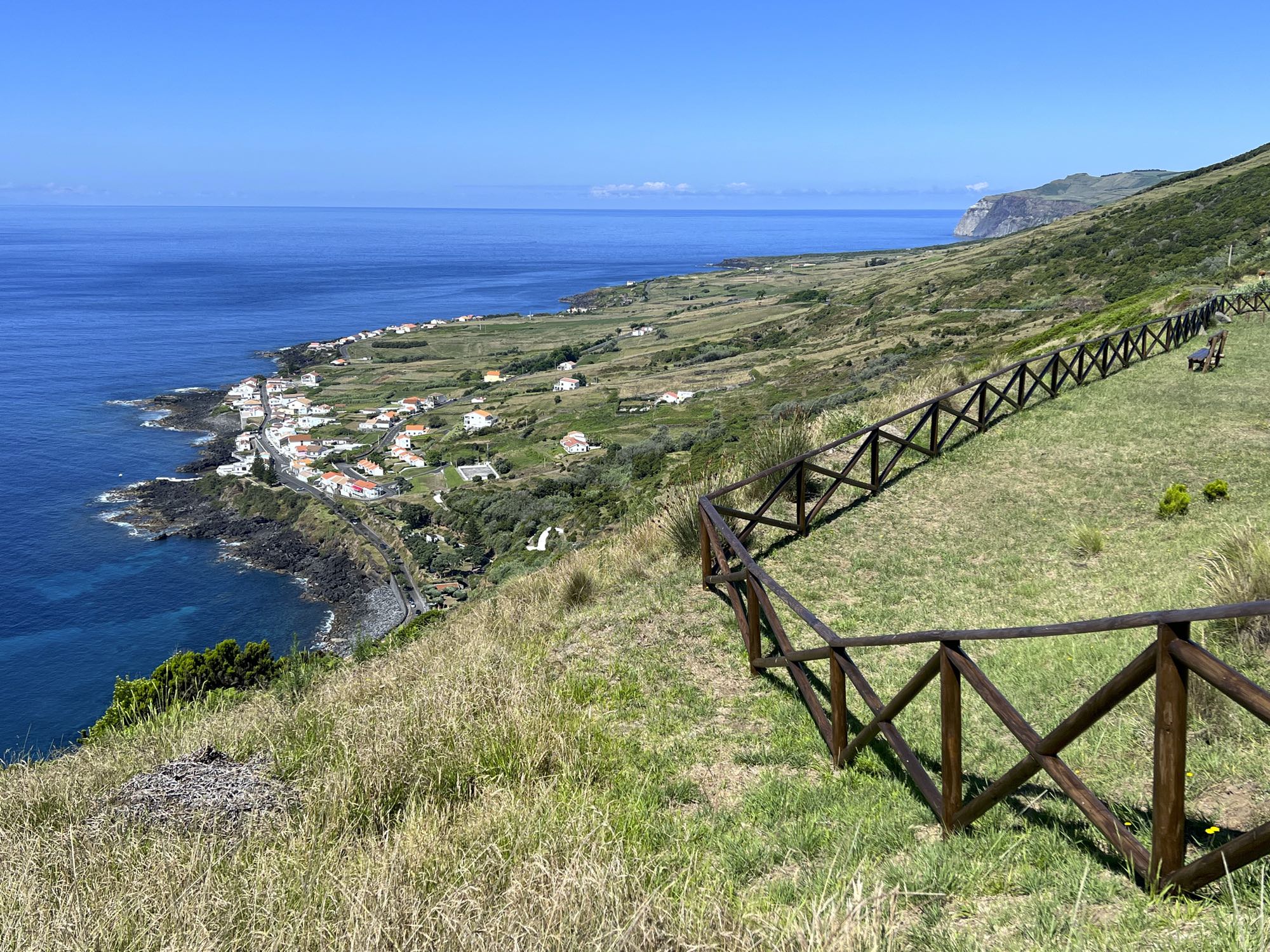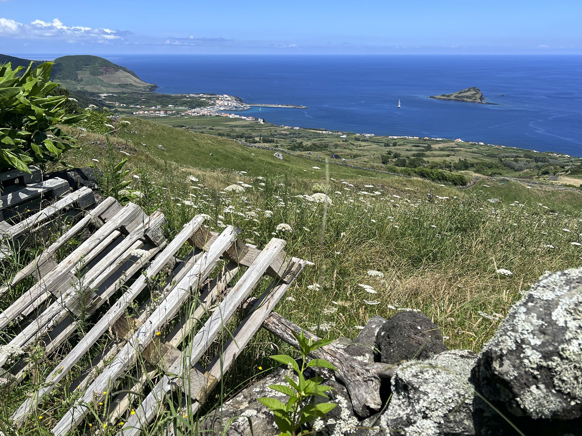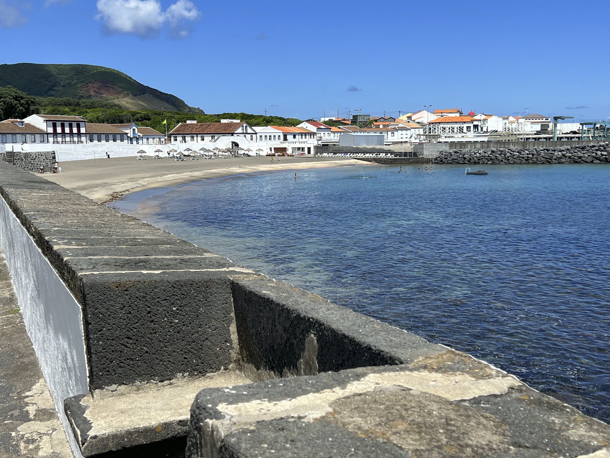 Von Praia de São Mateus aus steigen wir zunächst mühsam zum Rundweg um die Caldeira hinauf. Auf ihm genießen wir die Aussicht auf den gesamten Südteil von Graciosa. Bei guter Sicht sind auch die anderen Inseln der Zentralgruppe zu sehen. Bevor wir nach Carapacho mit seiner Therme absteigen, machen wir noch einen aussichtsreichen Abstecher zum Leuchtturm und Walausguck oberhalb der Ponta da Restinga.