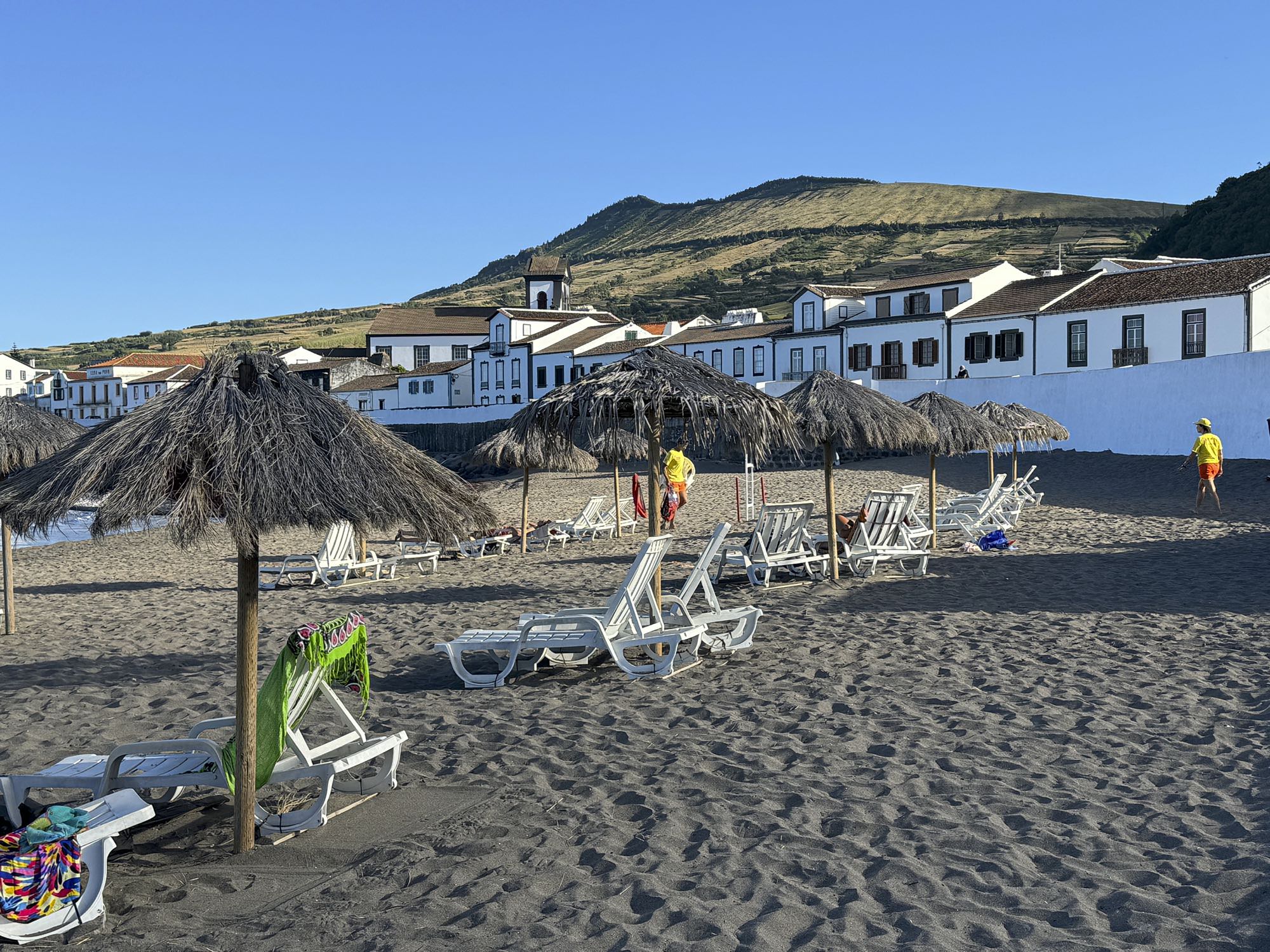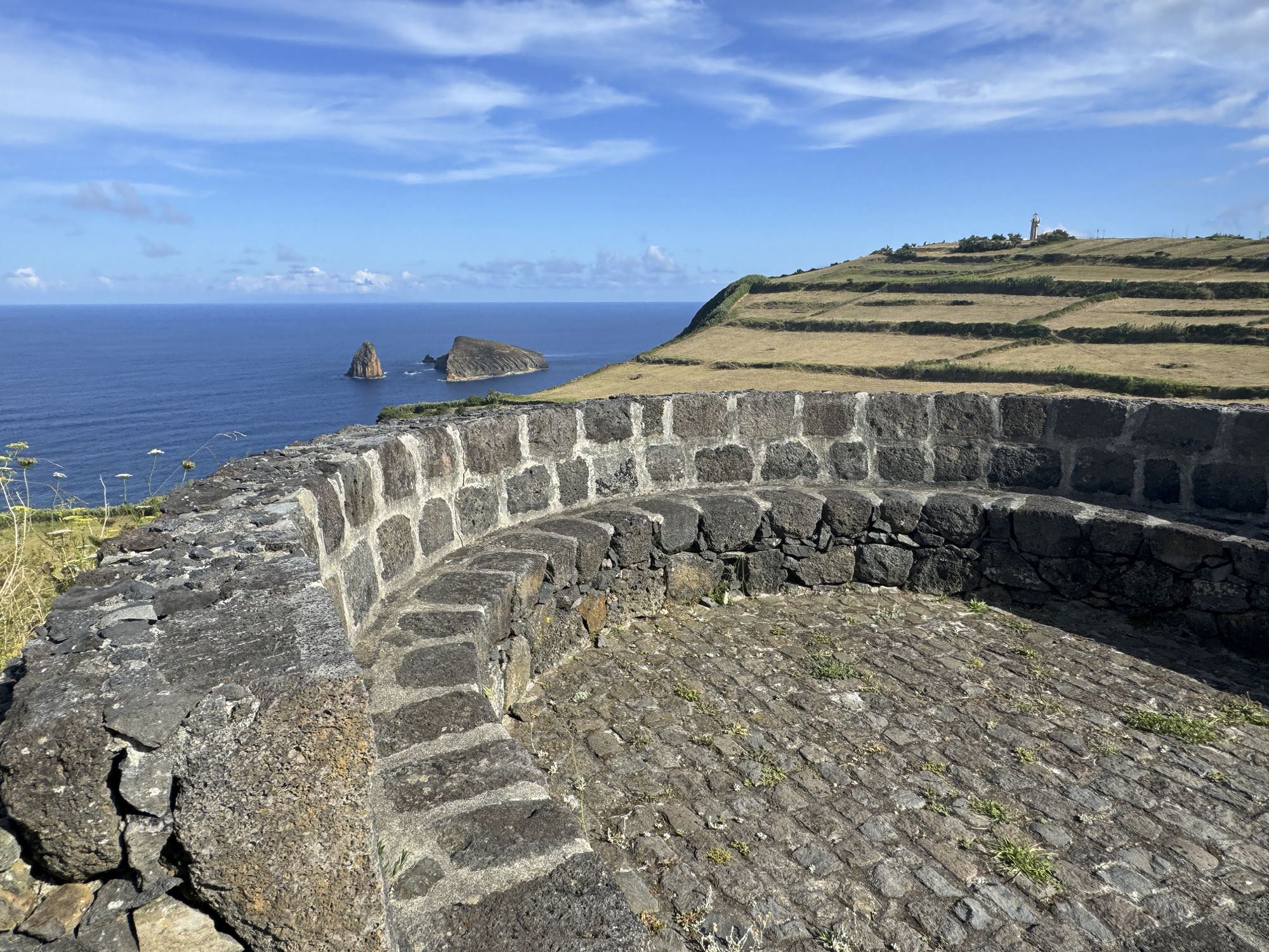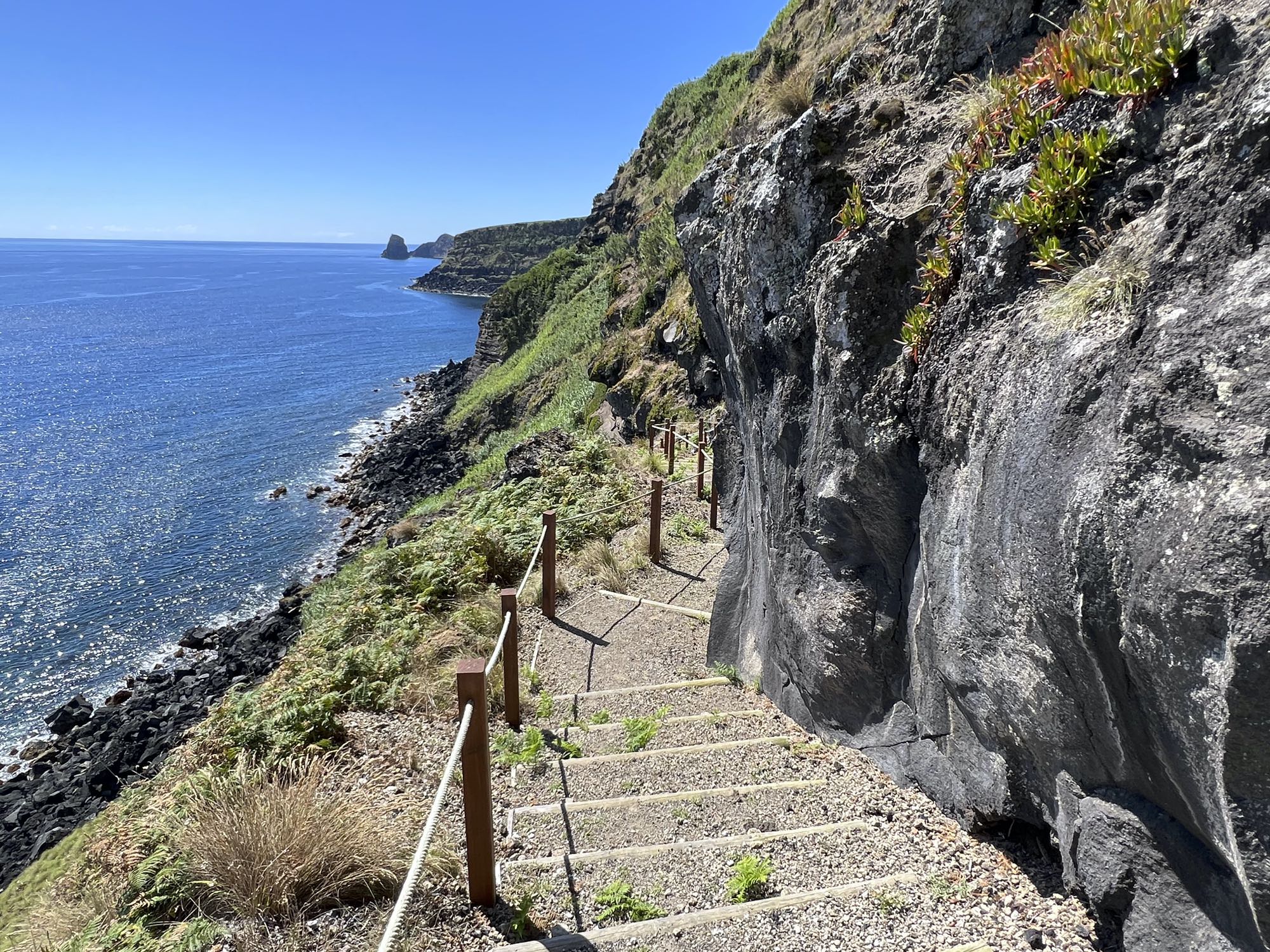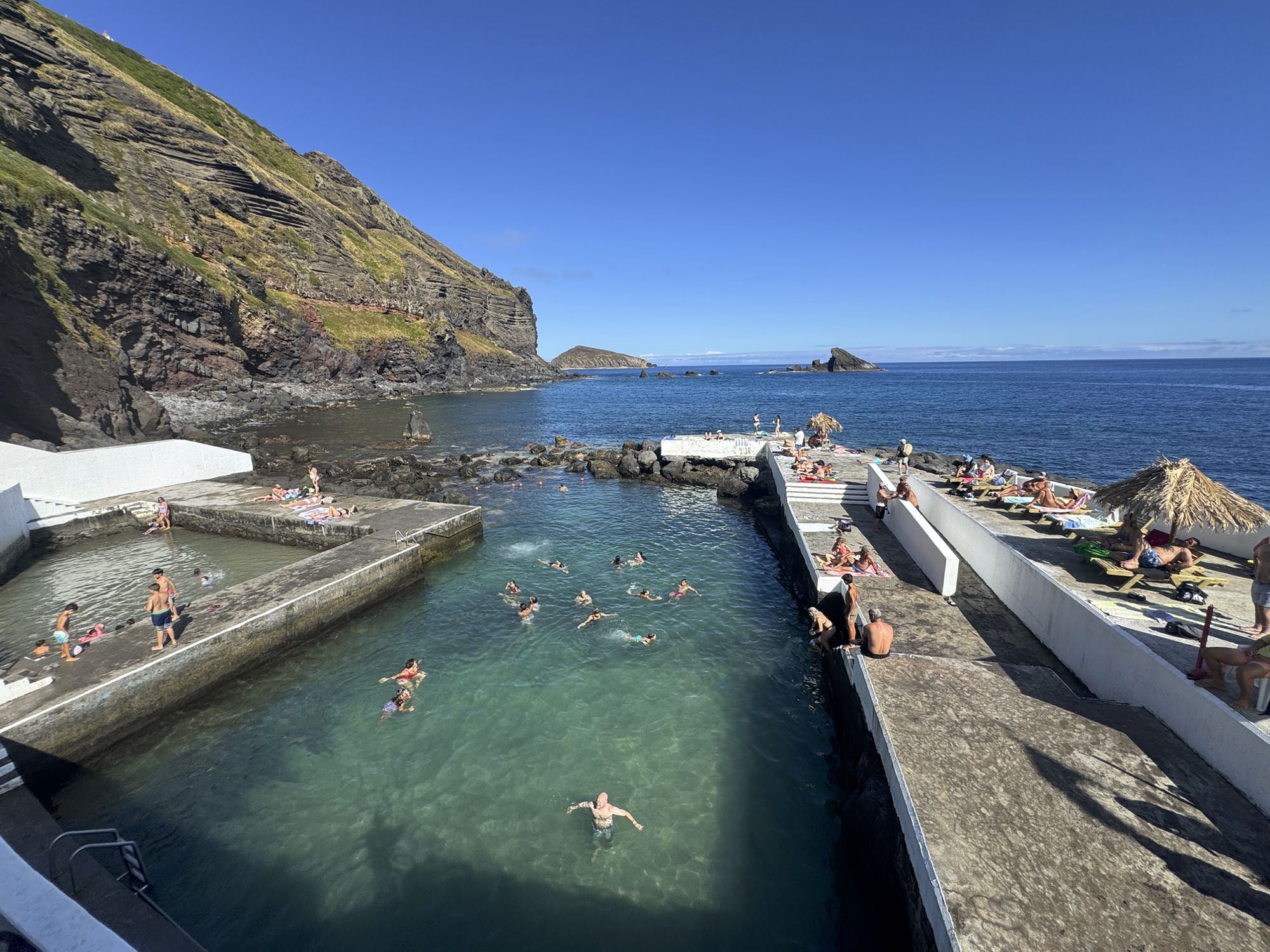 Von Praia de São Mateus aus steigen wir zunächst mühsam zum Rundweg um die Caldeira hinauf. Auf ihm genießen wir die Aussicht auf den gesamten Südteil von Graciosa. Bei guter Sicht sind auch die anderen Inseln der Zentralgruppe zu sehen. Bevor wir nach Carapacho mit seiner Therme absteigen, machen wir noch einen aussichtsreichen Abstecher zum Leuchtturm und Walausguck oberhalb der Ponta da Restinga.