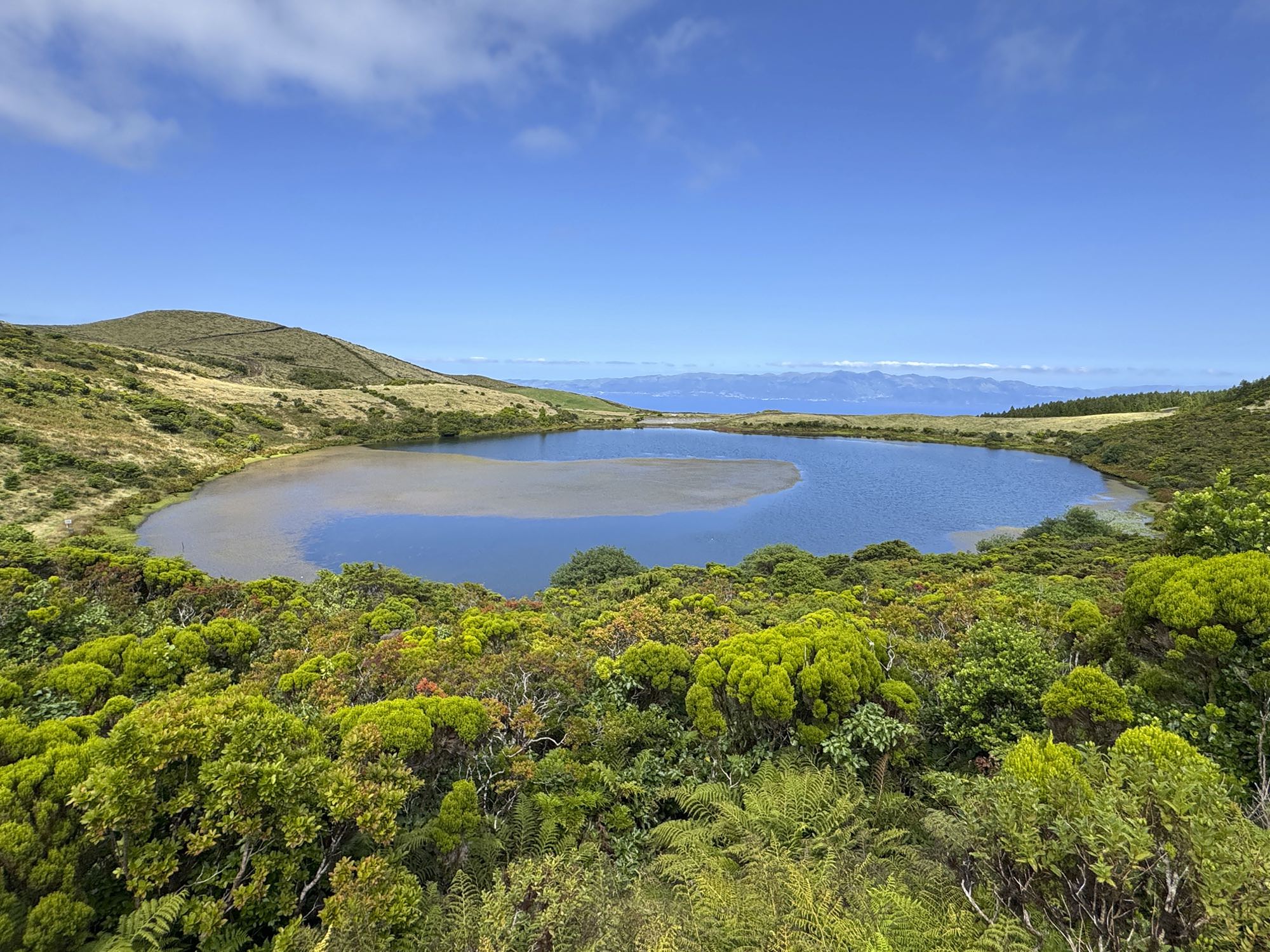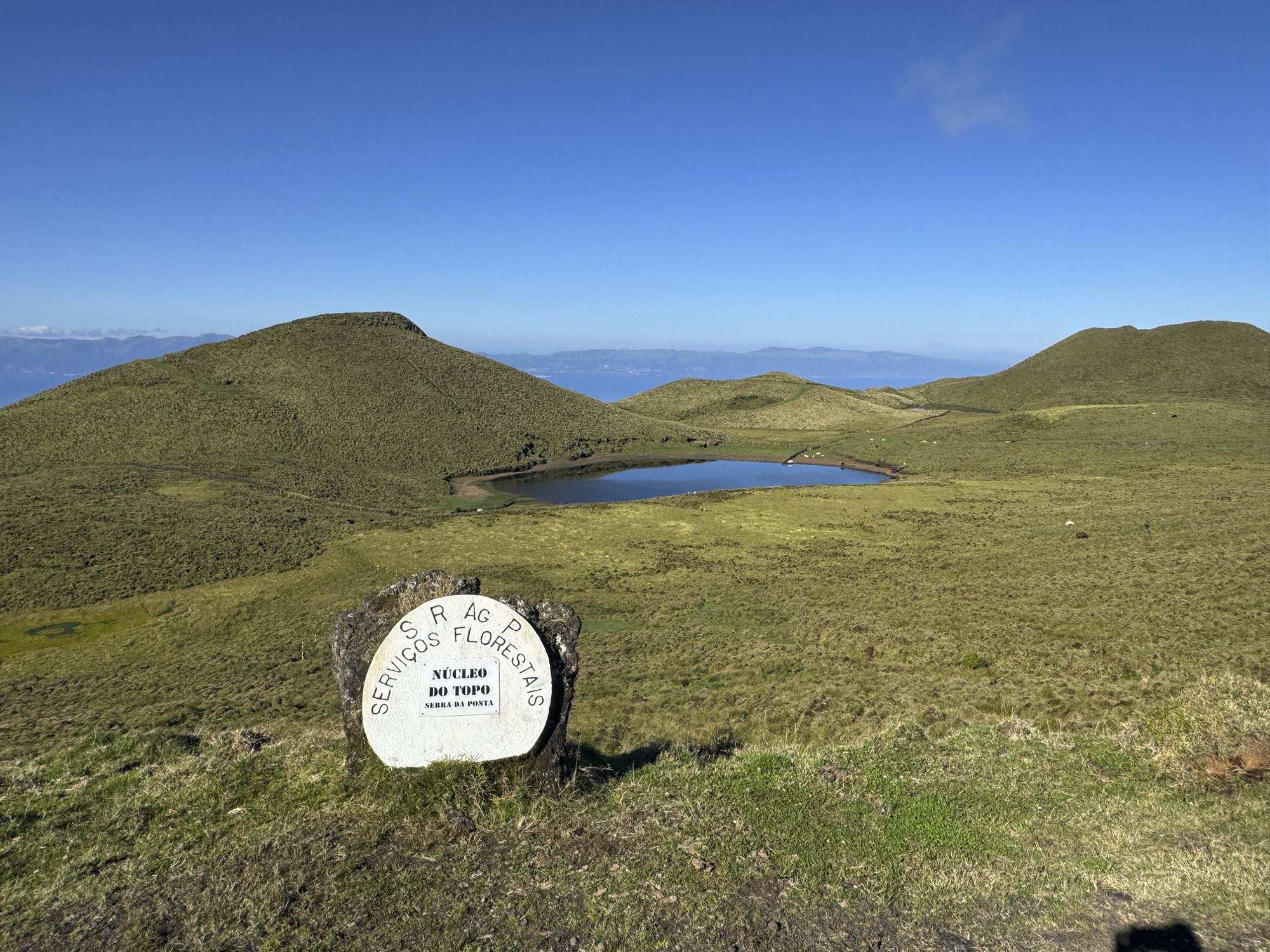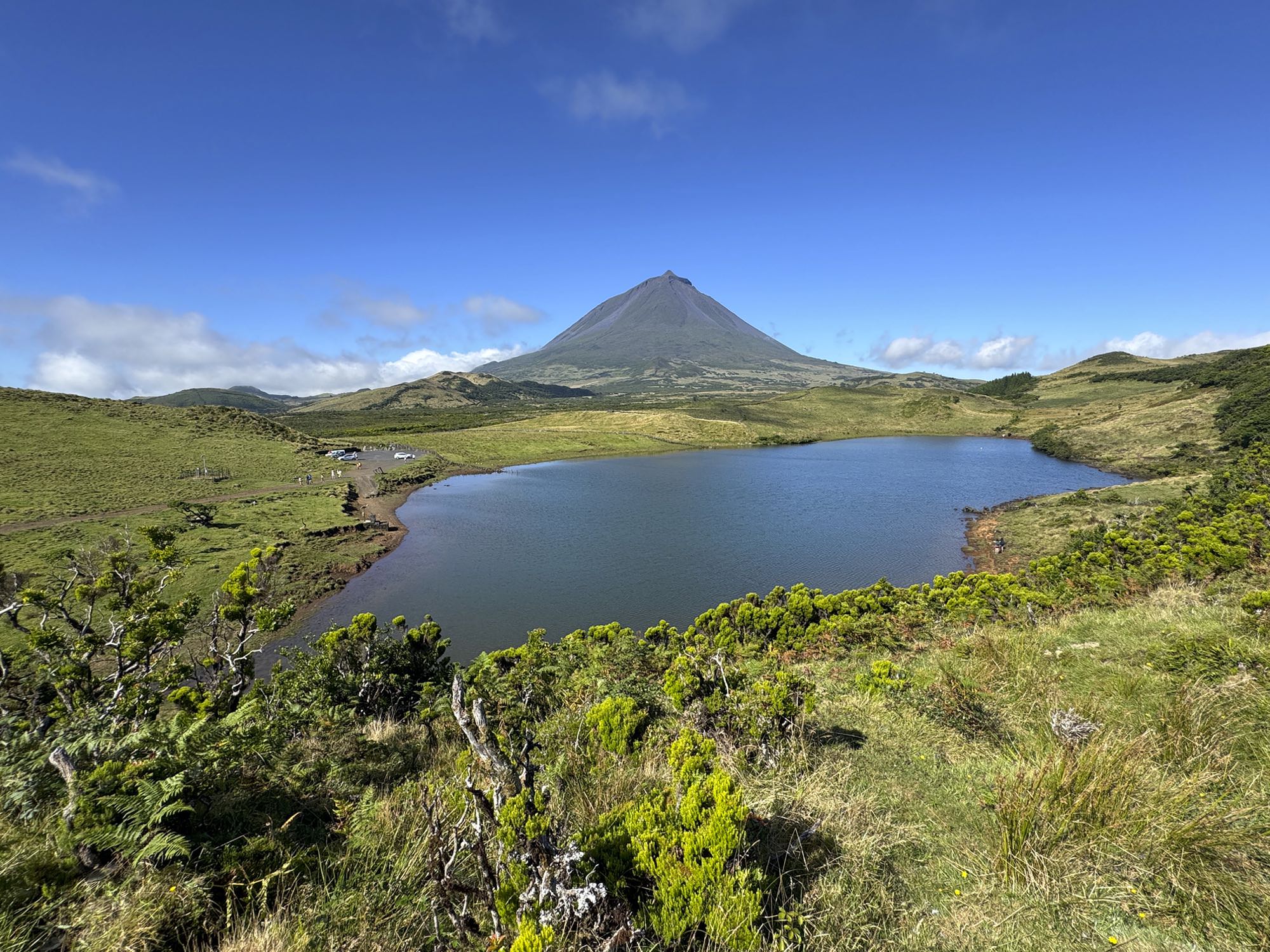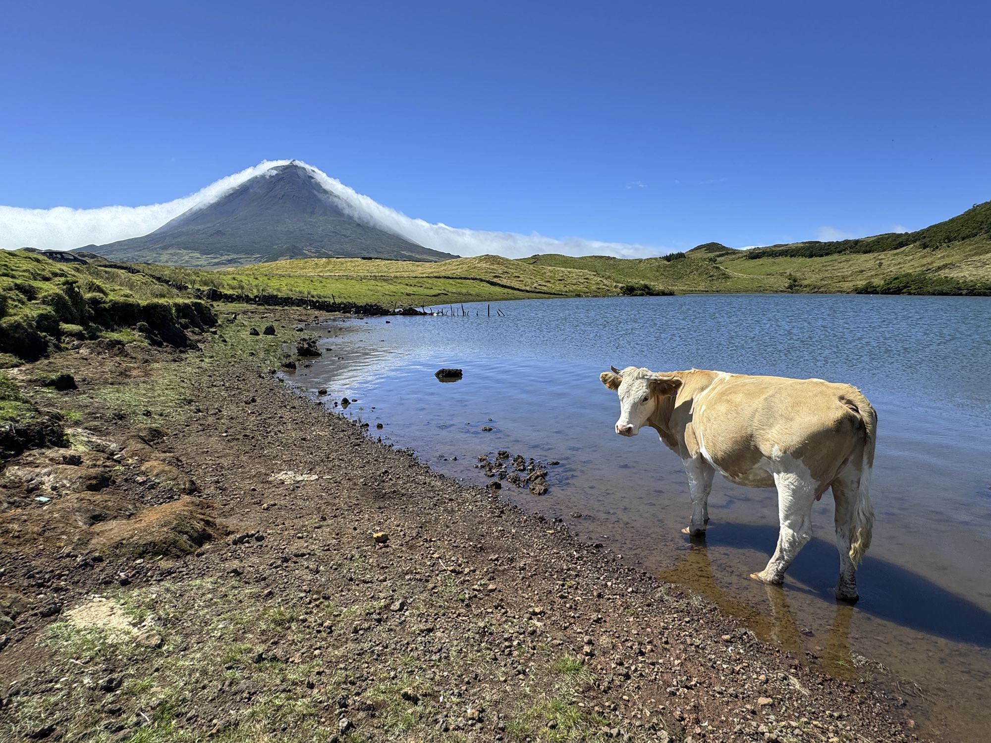 Wie an einer Perlenschnur aufgereiht liegen die Vulkankegel im Hochland von Pico. In vielen haben sich natürliche Kraterseen gebildet. Wir folgen dabei der Transversale durch das Hochland, das als offenes Weideland genutzt wird. Fast der gesamte Weg verläuft durch eine geschützte Zone. Und an klaren Tagen erblicken wir auch die Nachbarinseln São Jorge und Terceira.