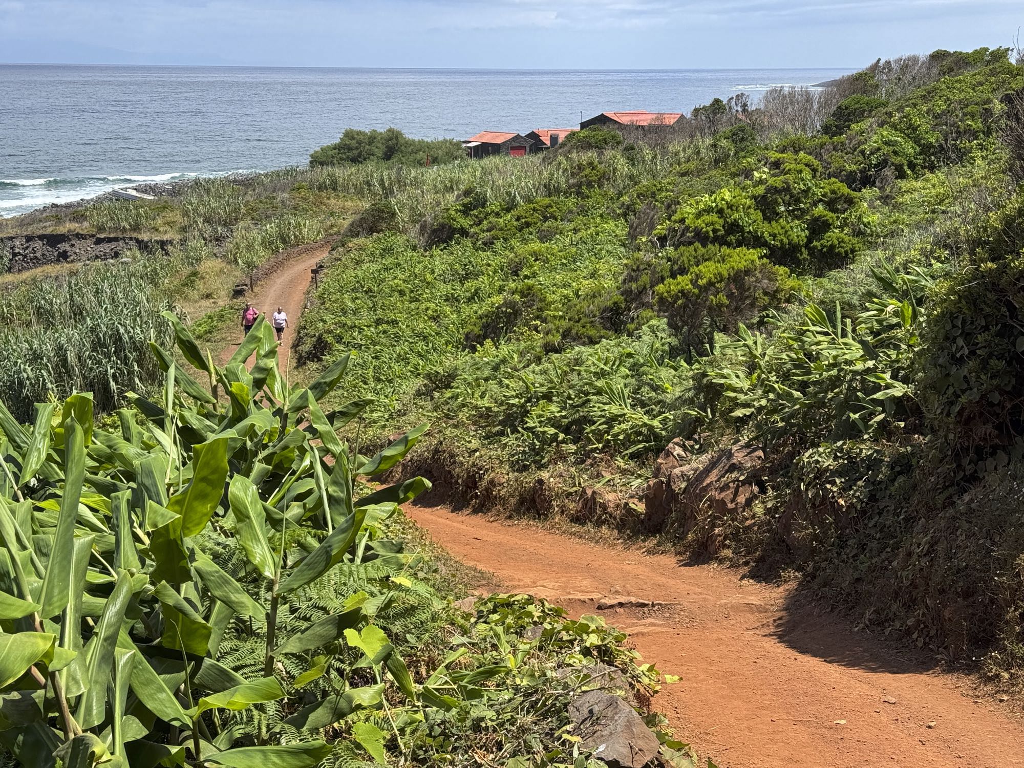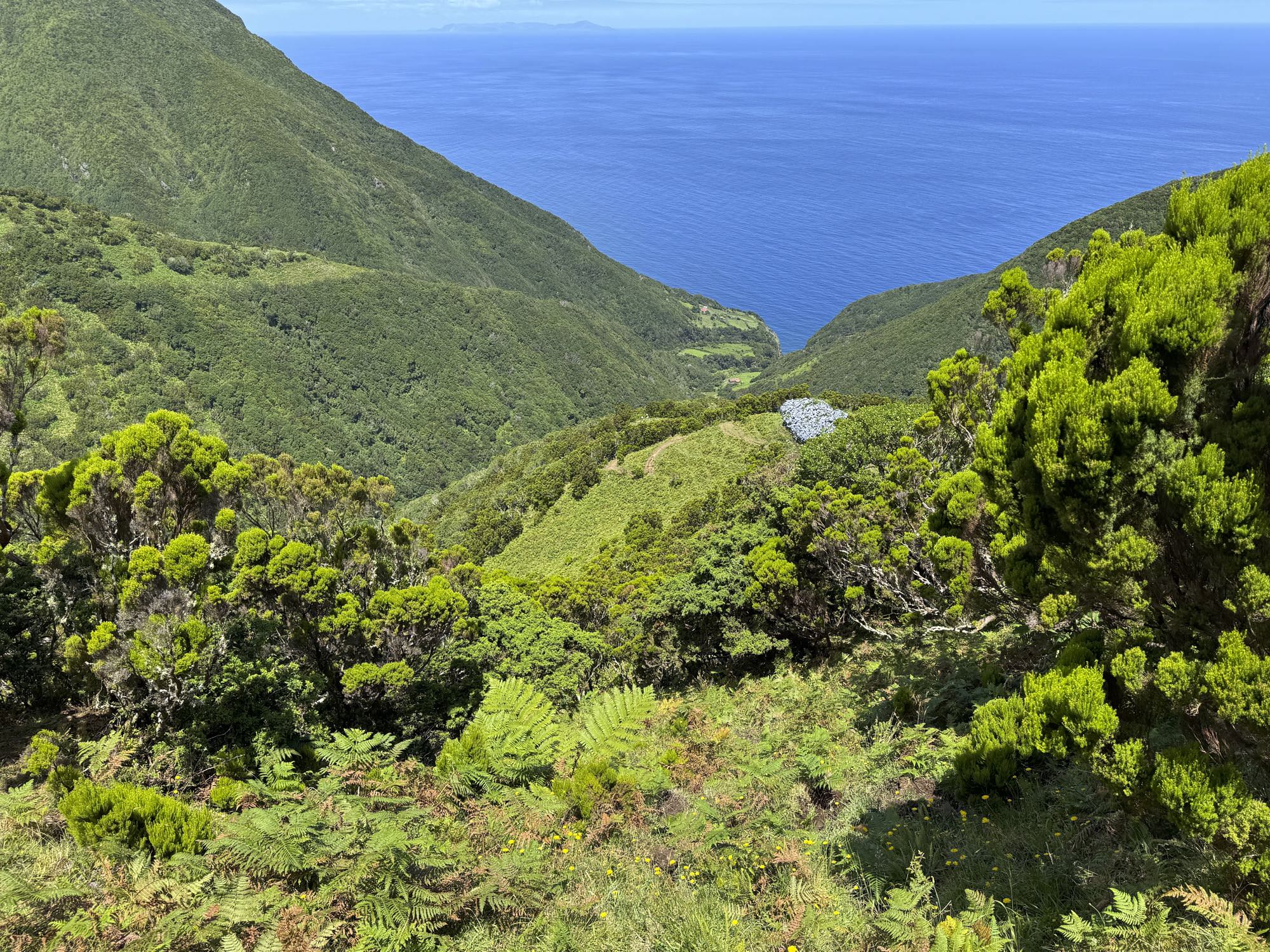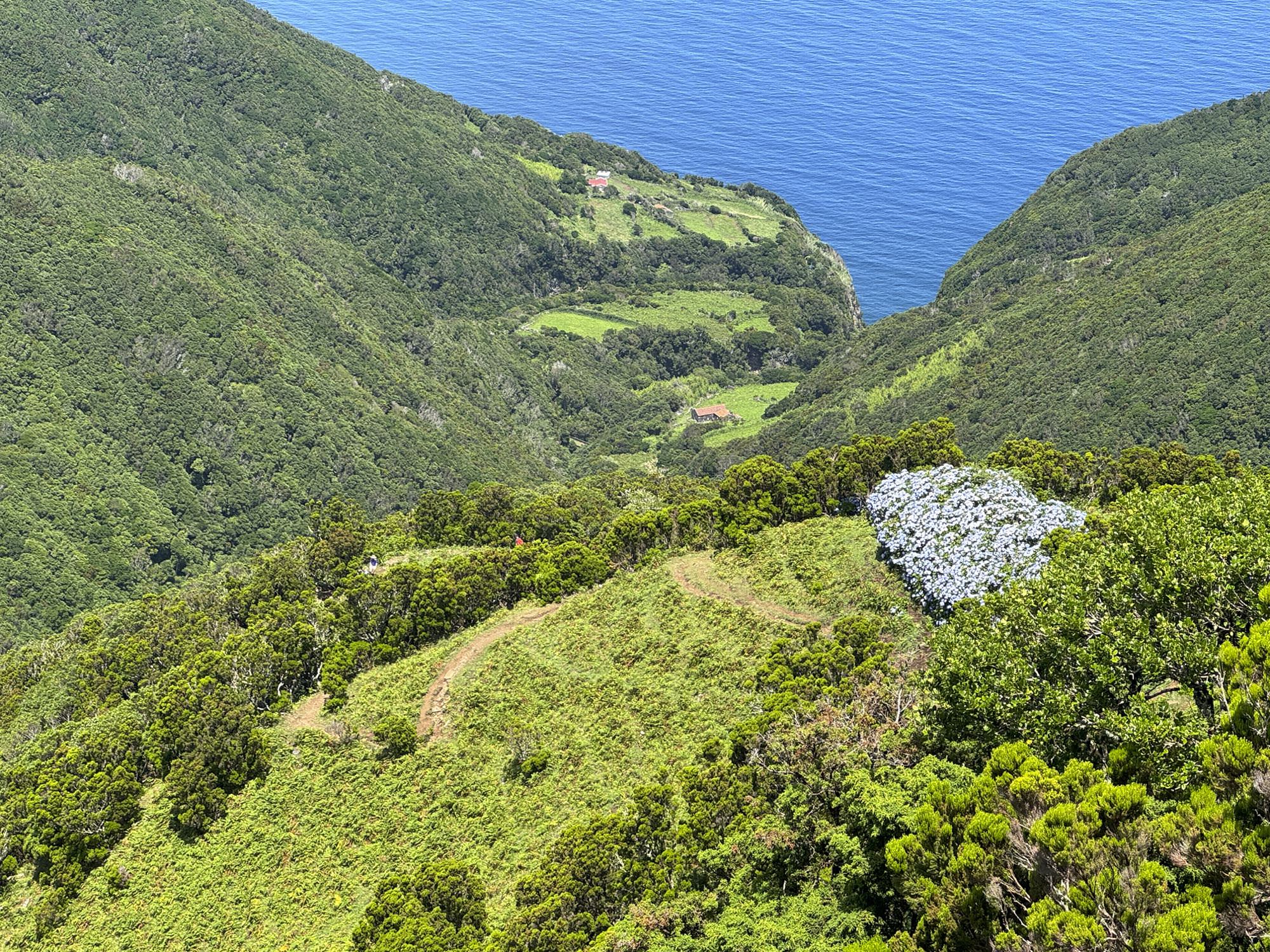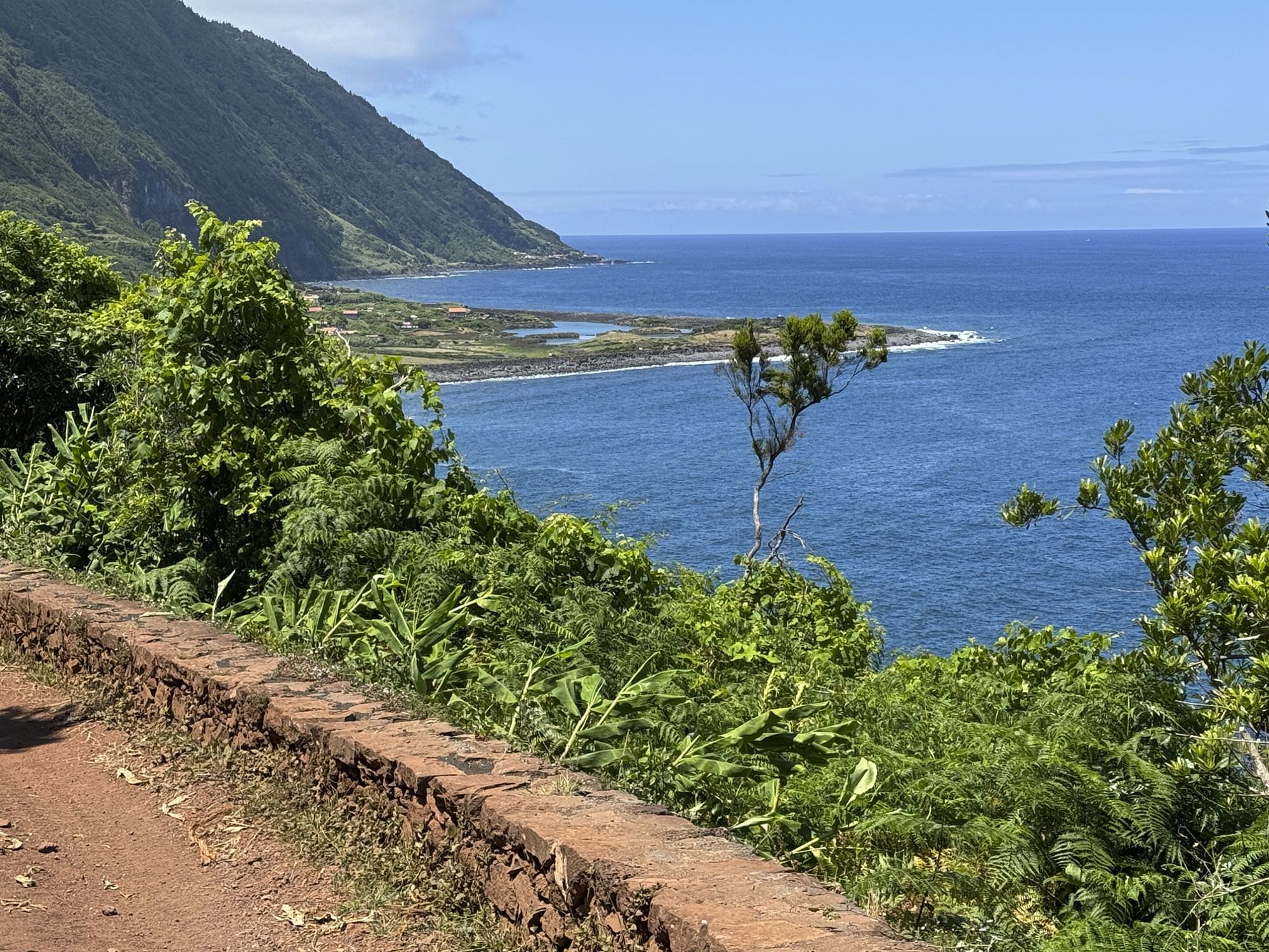 Keine Tour ist so beliebt wie der Abstieg von der Hochebene nach Fajã da Caldeira de Santo Cristo. Vom Windpark an der Serra do Topo folgen wir einem Eselspfad zu dieser einzigartigen Küstensiedlung mit der tiefblauen Lagune, die viele Bildbände schmückt. Über einen von Quads inzwischen breitgedrückten Weg geht es dann in leichtem Auf und Ab bequem zu der mit Fahrzeugen erreichbaren Fajã dos Cubres vor.
