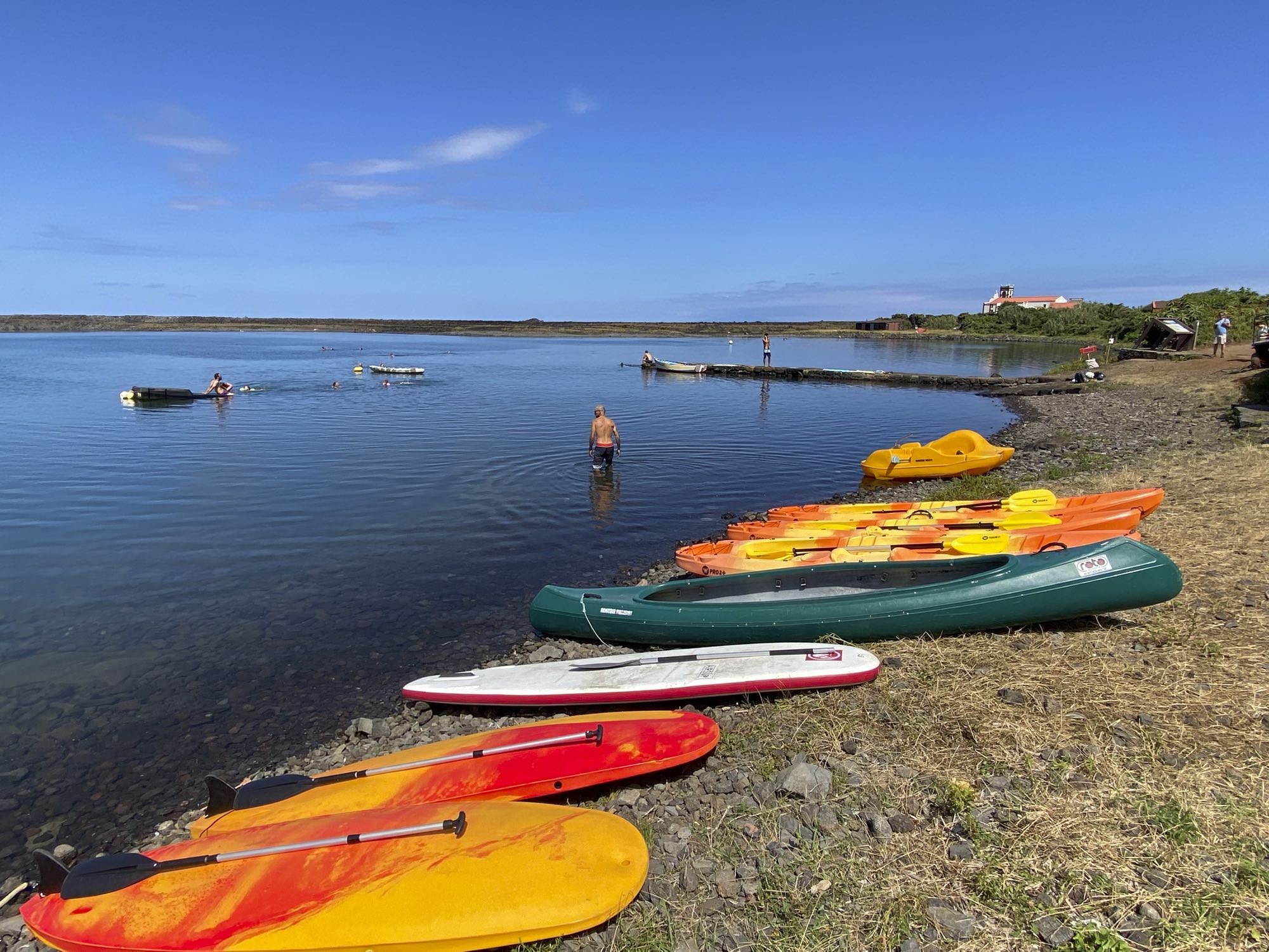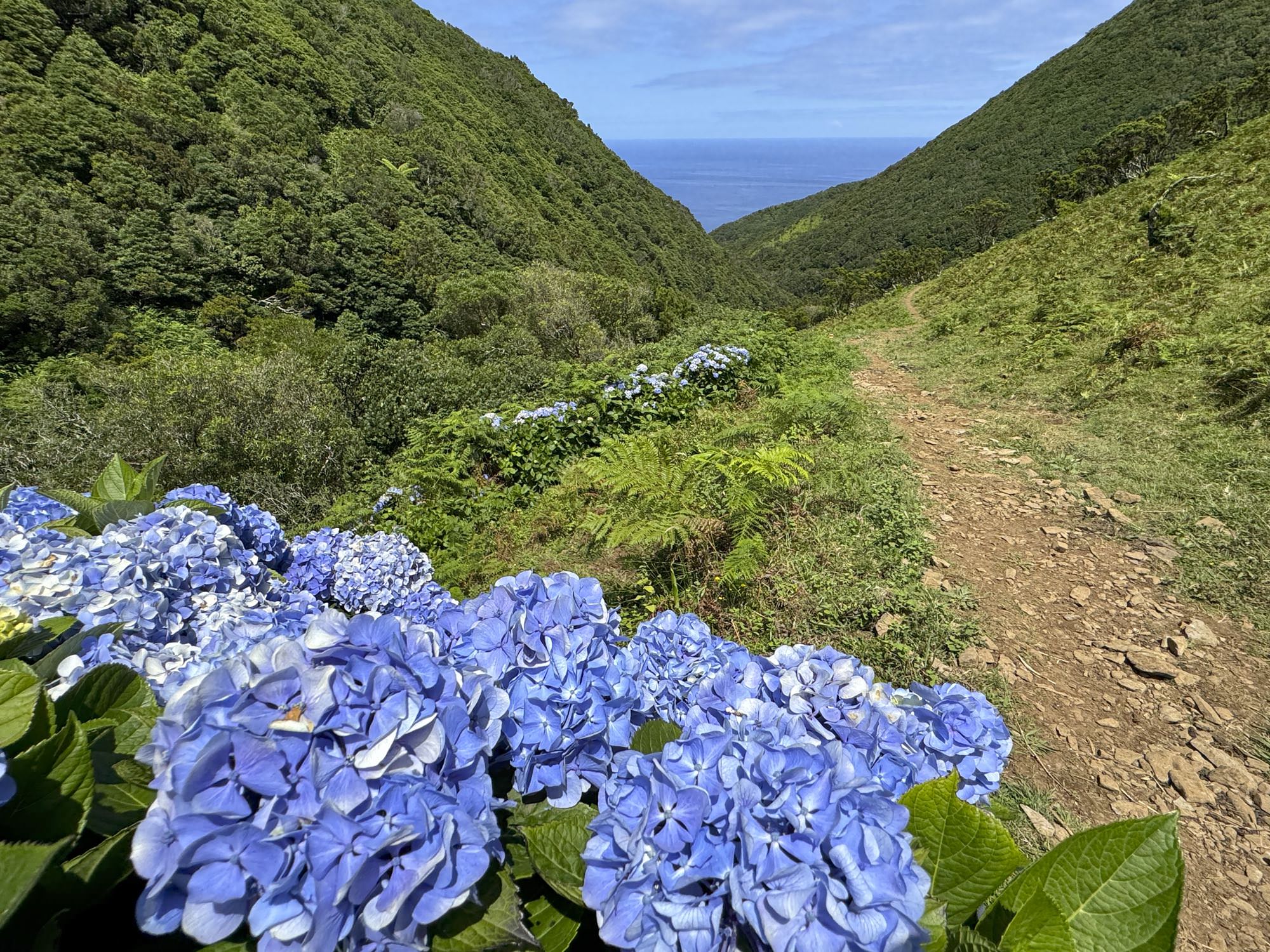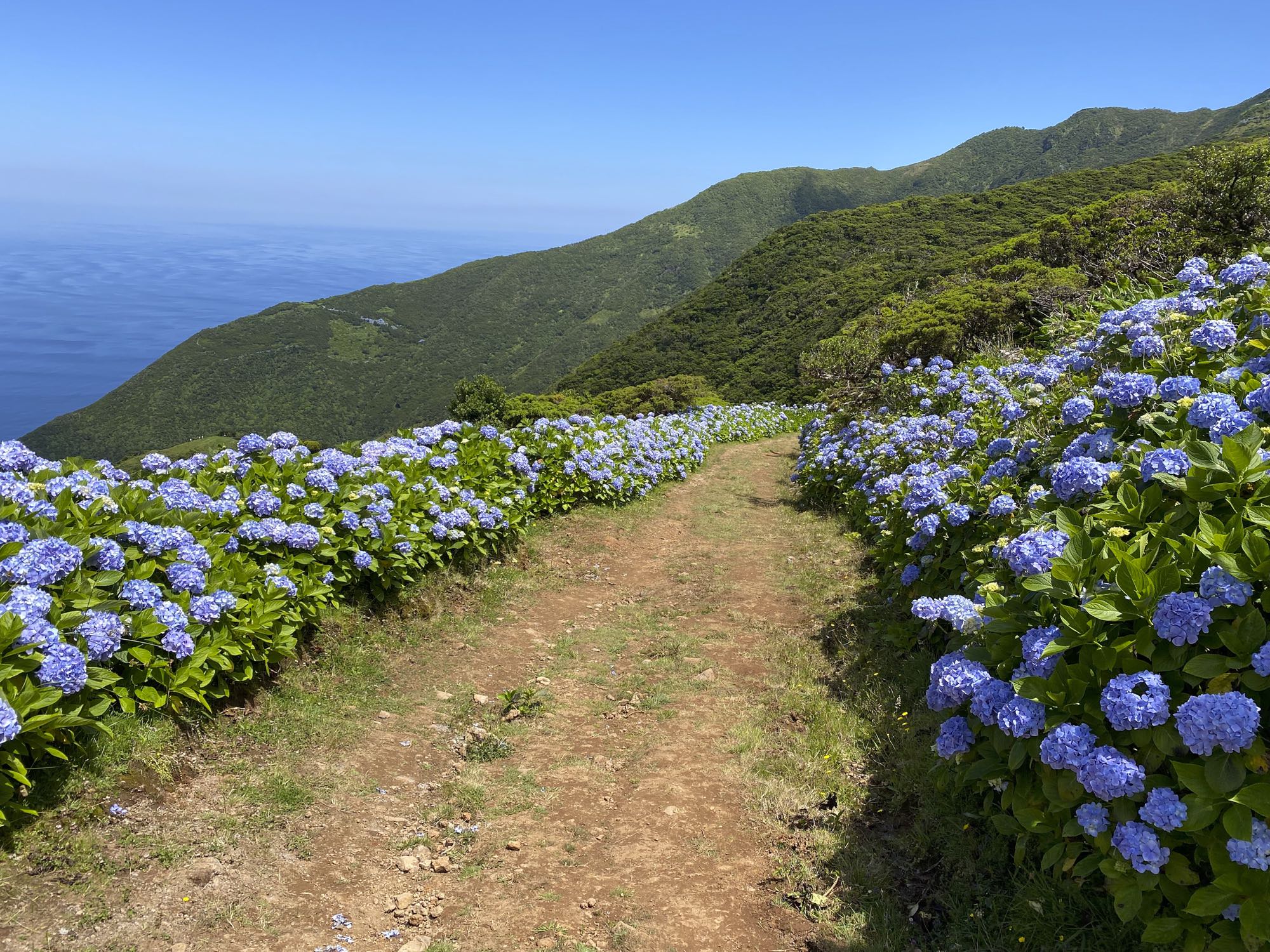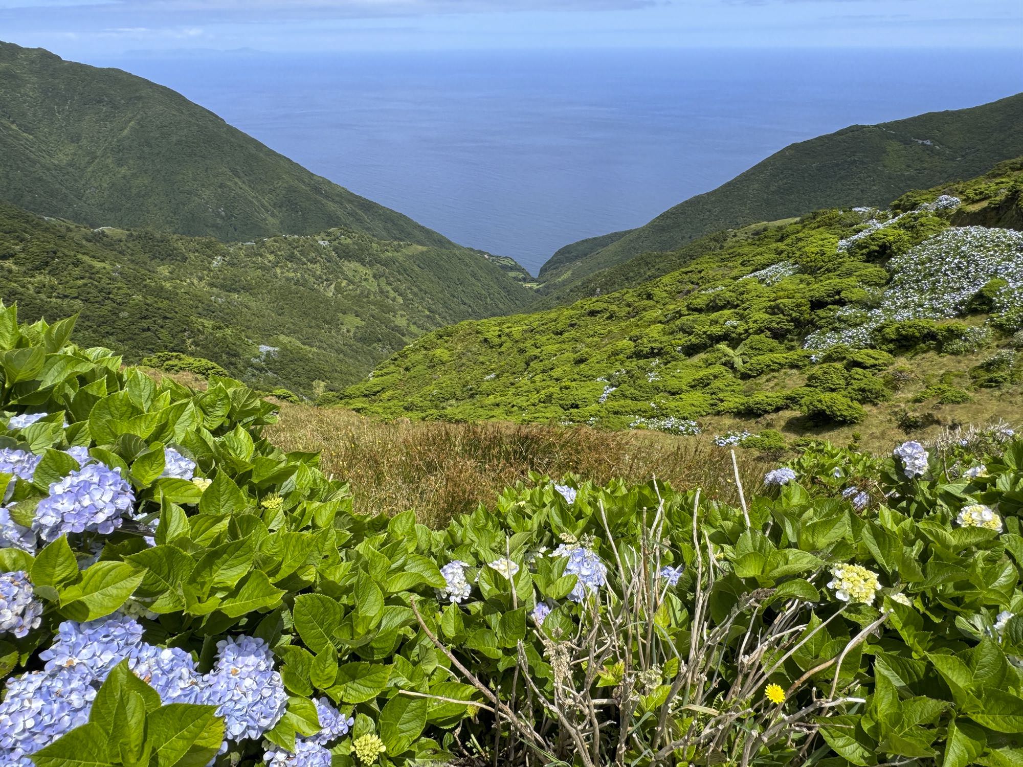 Keine Tour ist so beliebt wie der Abstieg von der Hochebene nach Fajã da Caldeira de Santo Cristo. Vom Windpark an der Serra do Topo folgen wir einem Eselspfad zu dieser einzigartigen Küstensiedlung mit der tiefblauen Lagune, die viele Bildbände schmückt. Über einen von Quads inzwischen breitgedrückten Weg geht es dann in leichtem Auf und Ab bequem zu der mit Fahrzeugen erreichbaren Fajã dos Cubres vor.