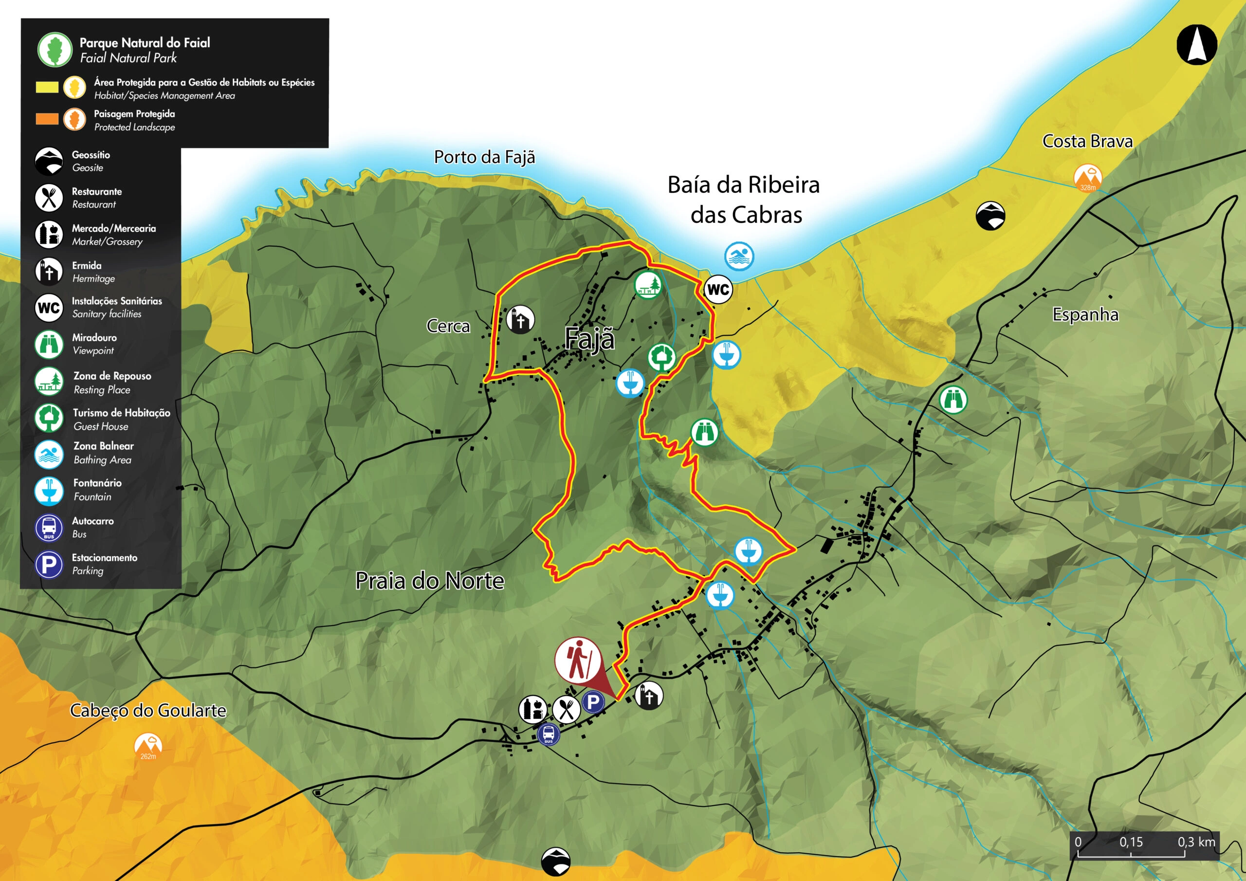 Eingebettet in das Schutzgebiet zur Erhaltung der Lebensräume und Arten von Capelinhos, der Nordküste und Varadouro, führt diese Route durch die Fajã da Praia do Norte, die durch den historischen Ausbruch des Vulkans Cabeço do Fogo im Jahre 1672 stark in Mitleidenschaft gezogen wurde. Die Fajã endet an der fossilen Steilküste von Praia do Norte und war ein bevorzugter Ort für die Besiedlung aufgrund ihres Mikroklimas, das den Anbau von Wein, den Bau von Weinkellern und Sommerhäusern ermöglichte.