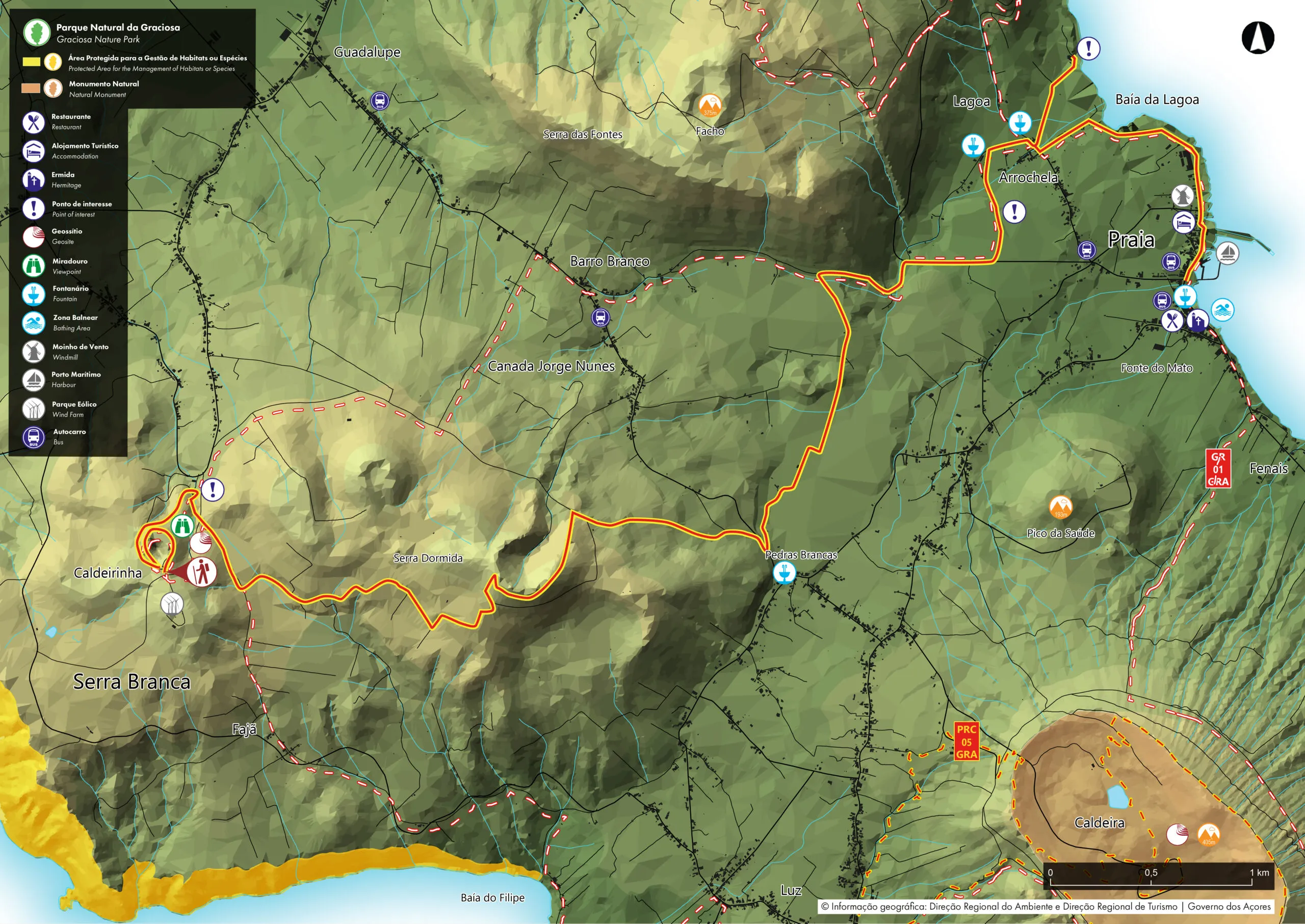 Landschaftlich bemerkenswert ist der Pico Timão, der zweithöchste Punkt der Insel (398 Meter), der einen weiten Panoramablick über Graciosa und die anderen Inseln der Zentralgruppe bietet. Der Pico Timão entspricht dem Emissionszentrum der letzten Eruption auf der Insel vor weniger als 2.000 Jahren, deren Lava an der Ostküste im Gebiet von Praia ins Meer floss, und ist ebenfalls als Geosite klassifiziert. Neben der bedeutenden geographischen Vielfalt weist der Weg auch interessante Elemente der biologischen Vielfalt auf, darunter einheimische und endemische Pflanzen wie Erica azorica, Calluna vulgaris, Morella faya und seltenere Arten wie Corema album und Platanthera pollostantha.