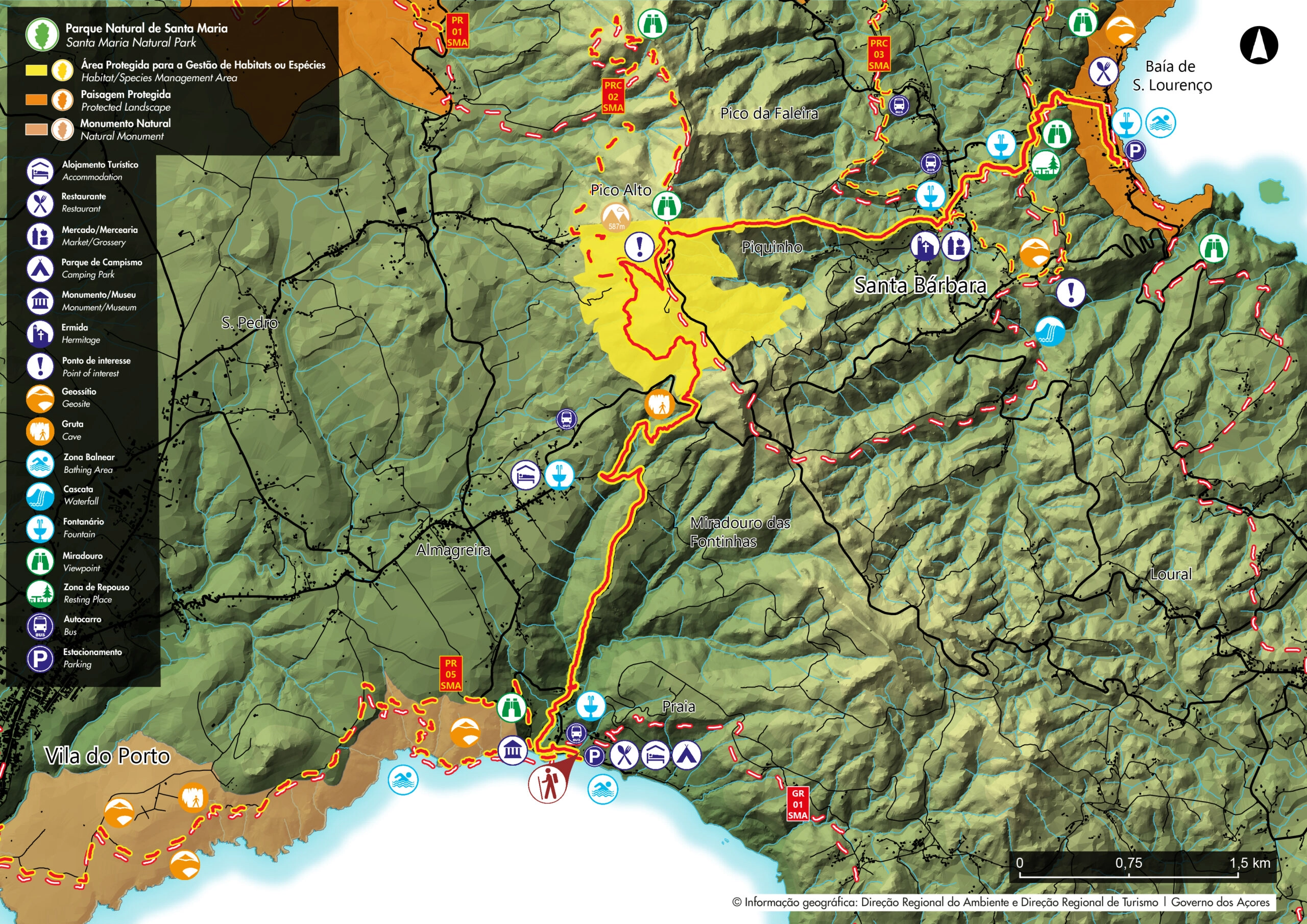 In der Gegend von Almagreira führt der Weg durch einen Wald, der hauptsächlich aus Australischem Käsewald (Pittosporum undulatum) besteht, aber auch endemische Buschvegetation wie Weißholz (Picconia azorica) und Azorische Stechpalme (Ilex azorica) aufweist. Vorbei an einer Höhle erreicht man den Pico Alto (Kreuzung mit PRC 02 SMA – Pico Alto), den höchsten Punkt von Santa Maria, wo man sich ausruhen und die Aussicht auf den Rest der Insel genießen kann.