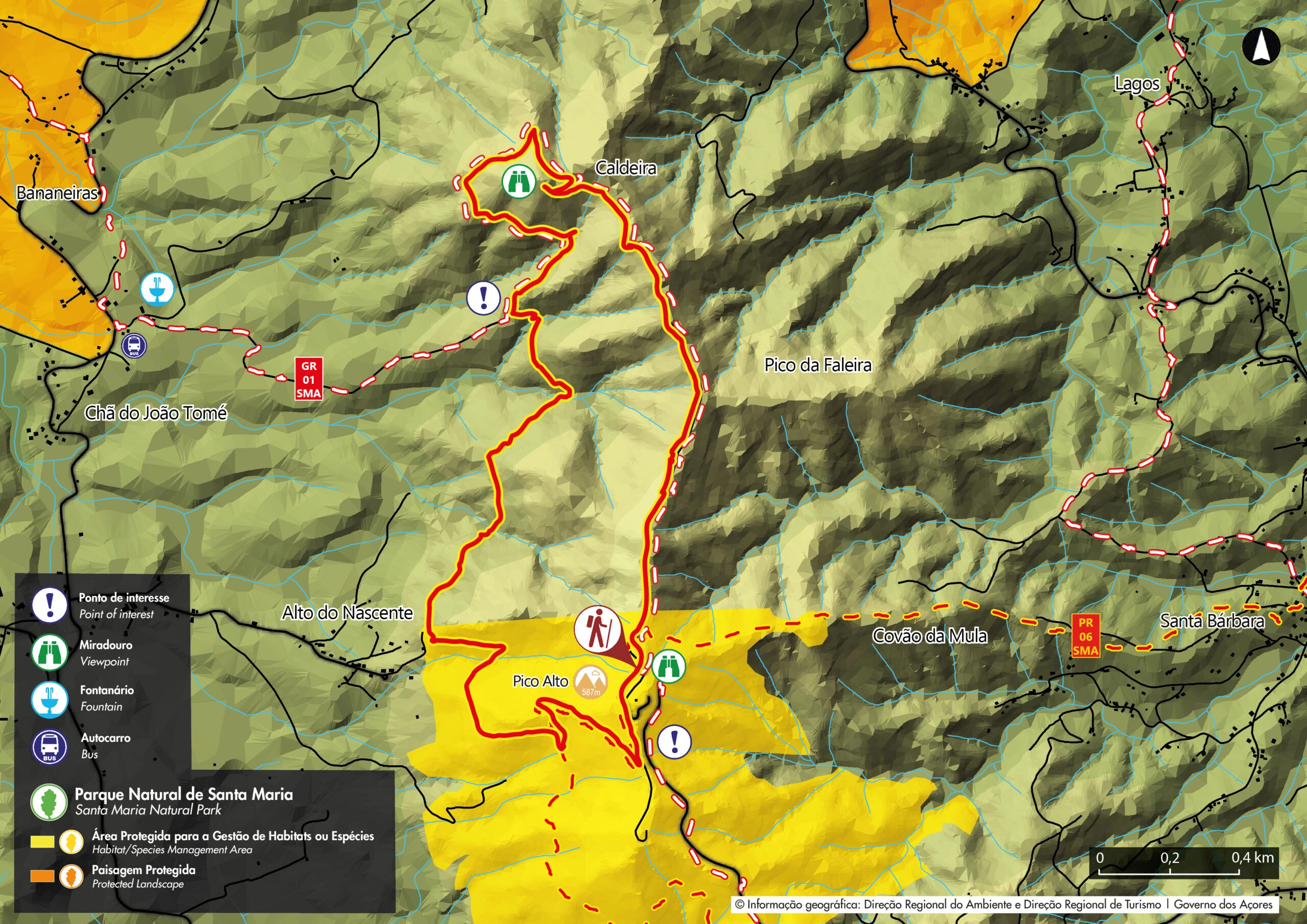 Die Route führt weiter bergab und kurvenreich vorbei an einer Abzweigung nach links zum Aussichtspunkt Caldeira. Von dort aus hat man einen beeindruckenden Blick auf die Westküste der Insel. Zurück auf dem Hauptweg passieren Sie die Casa do Guarda und den Kreuzungspunkt mit dem Fernwanderweg Santa Maria (GR 01 SMA). Von hier aus geht es in Richtung Süden und weiter in Richtung der Ortschaft Alto Nascente.
