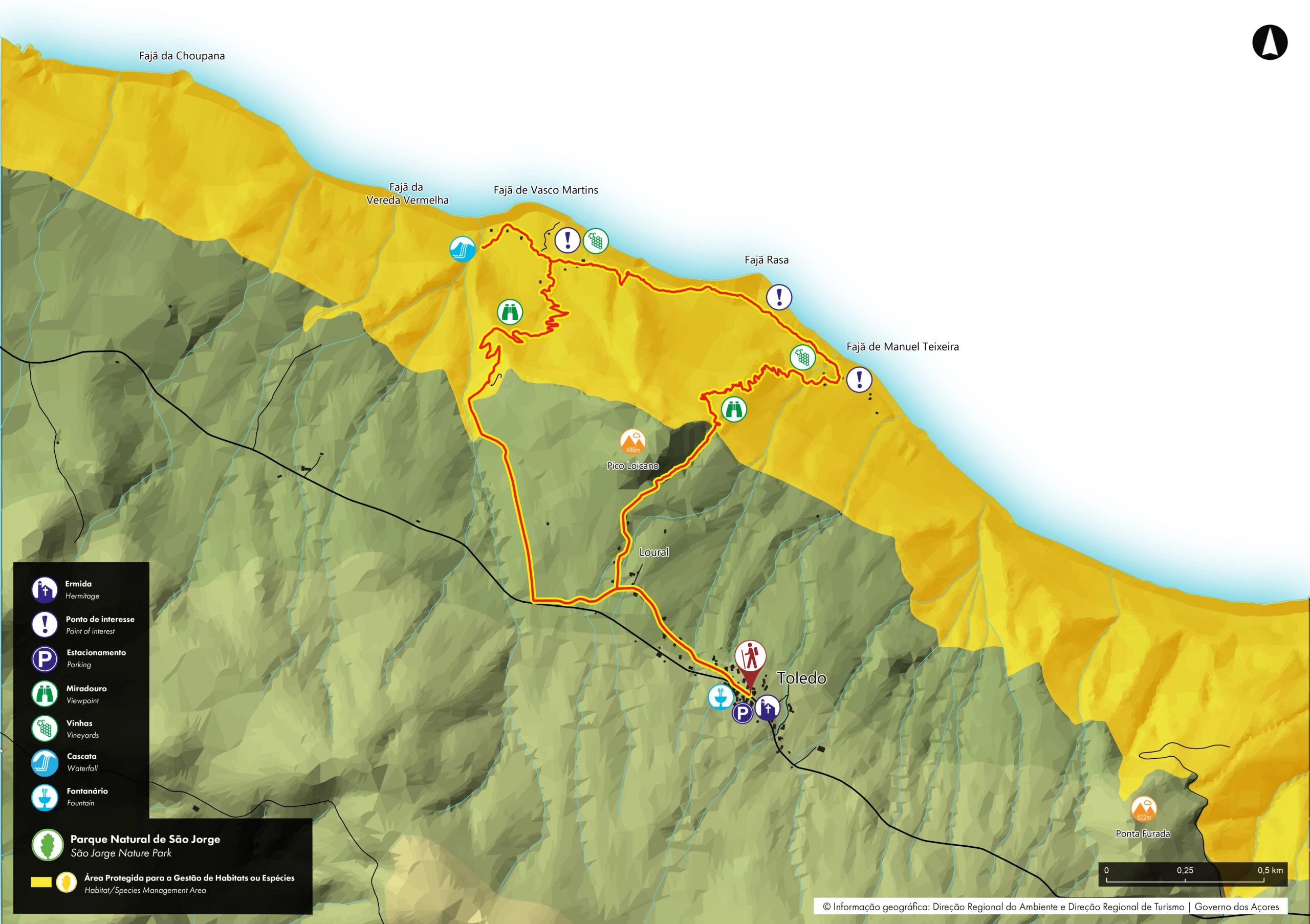 Dieser Rundweg beginnt in Toledo und verläuft teilweise durch den Naturpark São Jorge. Dieser ist ein Schutzgebiet zur Bewirtschaftung von Lebensräumen und Arten an der Nordwestküste. Er befindet sich im Kerngebiet des Biosphärenreservats Fajãs de São Jorge und führt zu den drei charakteristischen Fajãs Manuel Teixeira, Rasa und Vasco Martins. Die Fajãs sind ein Markenzeichen der Insel São Jorge. Es handelt sich um flache, meist kleine Landstriche am Meer, die durch Erdrutsche von den Klippen oder durch Lavaströme entstanden sind. Aufgrund ihrer Fruchtbarkeit und ihres günstigen Mikroklimas ermöglichen sie den Anbau von Kulturen, die in den höheren Lagen der Insel nur schwer gedeihen würden.