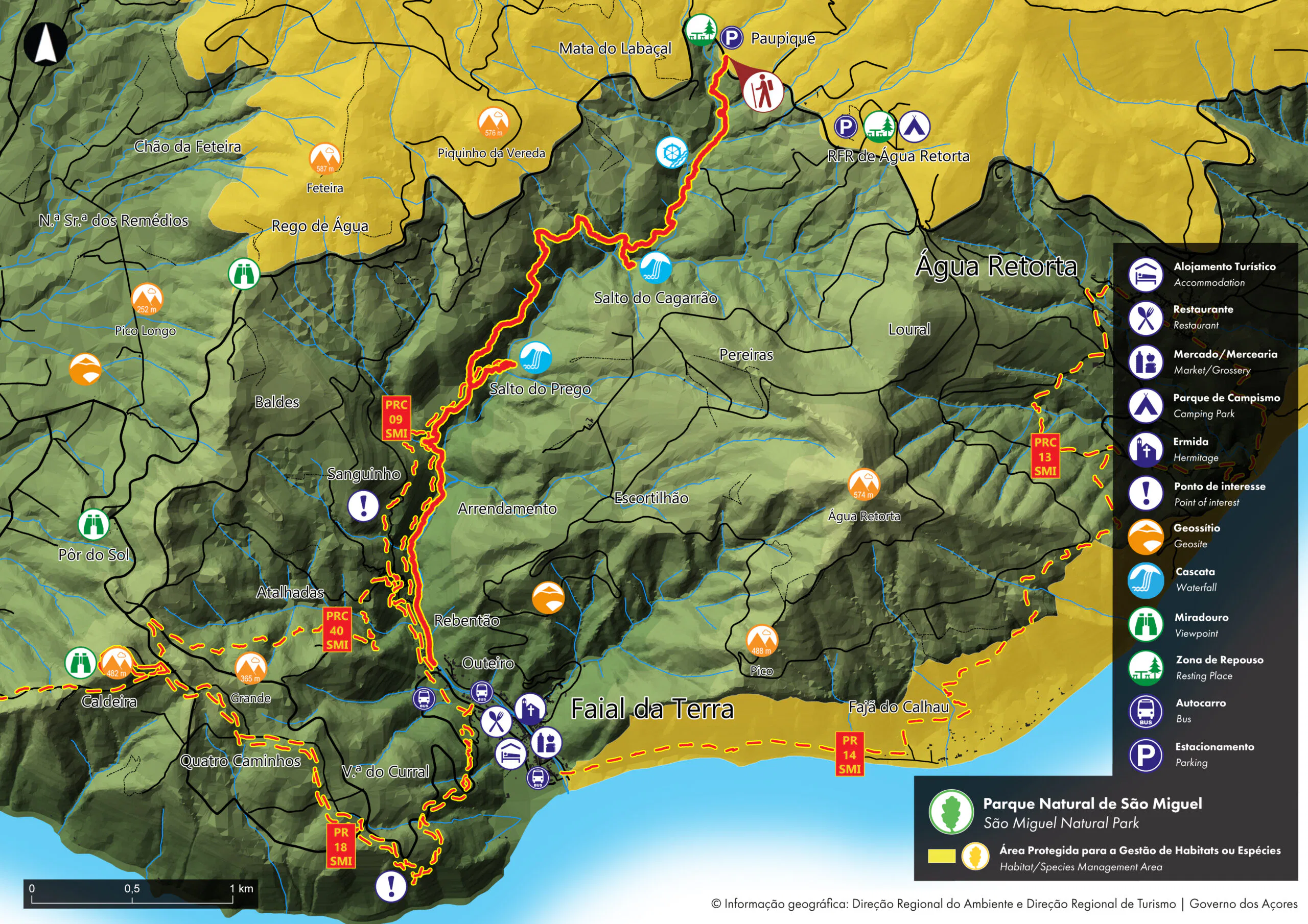 Nach einem Abstecher zum Salto do Cagarrão, einem imposanten Wasserfall, geht es zurück auf den Hauptweg in Richtung Süden. An der Kreuzung mit dem Wanderweg PRC 09 SMI – Sanguinho biegt man nach links in Richtung Salto do Prego ab. Hier kann man sich am Fuße des Wasserfalls ausruhen oder den höher gelegenen Teil des Flusses erkunden.
