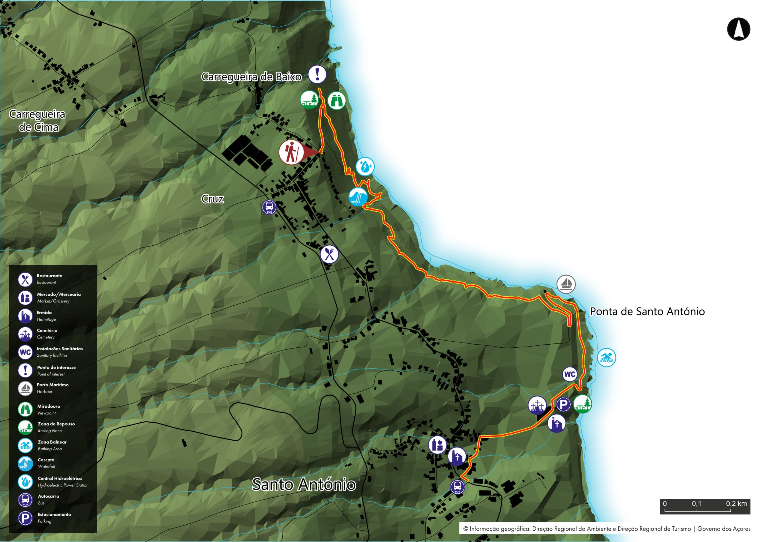 Der Weg beginnt an der Straße und führt über einen Zementweg hinunter zum Picknickplatz Fonte Grande. Von hier aus kann man einen Abstecher (Hin- und Rückweg) zu den kürzlich restaurierten Steintrögen machen, die früher von der Bevölkerung zum Wäschewaschen benutzt wurden (Foto 1). Der Rückweg bietet einen schönen Ausblick auf die Küstenlandschaft.