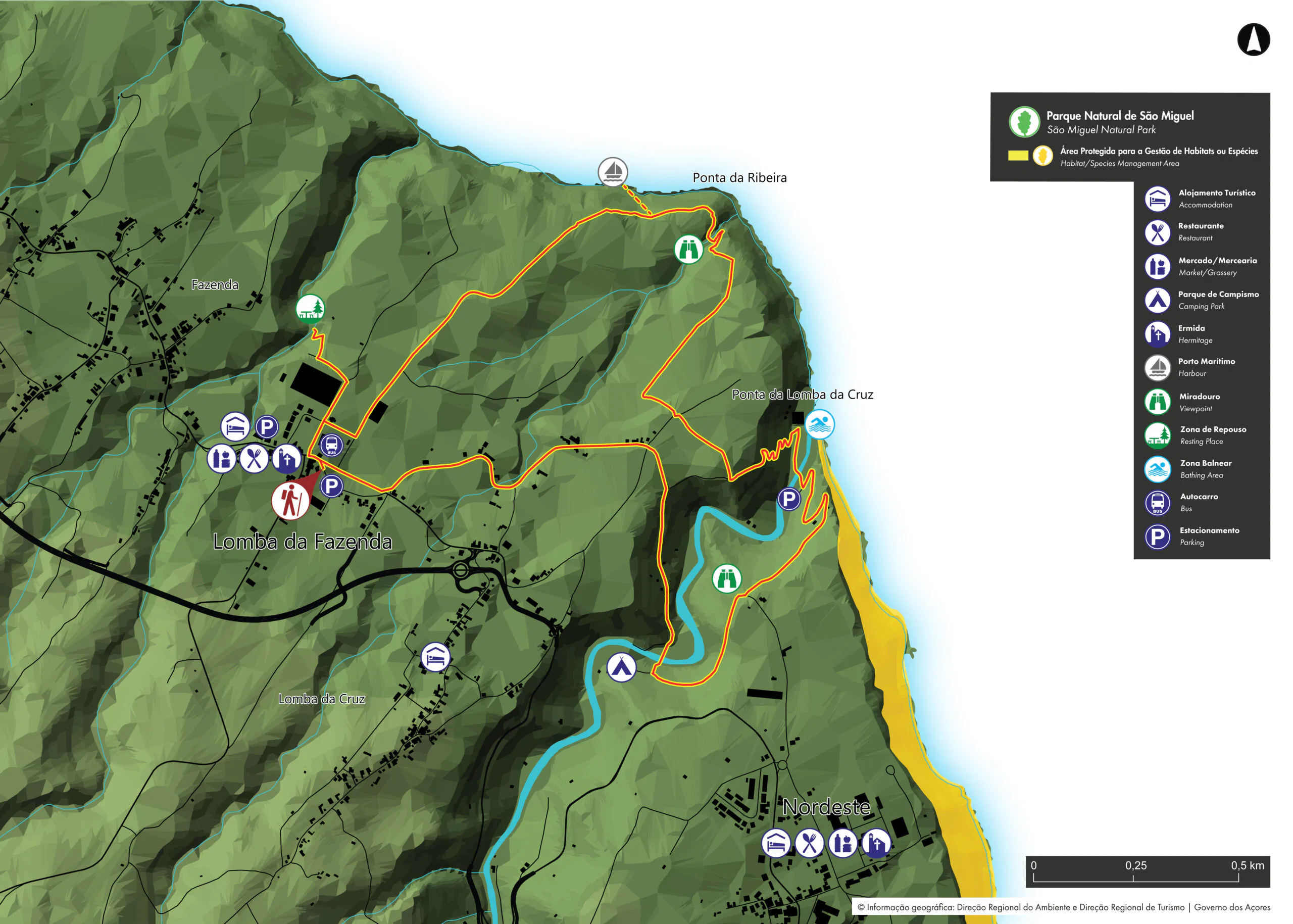 Man kehrt zum rechten Ufer zurück und folgt den Markierungen, vorbei an mehreren Wasserfällen, in Richtung Flussmündung. Ab hier beginnt der Weg anzusteigen und führt über eine Treppe an der „Rocha do Padre do Norte“ entlang. Wegen der großen Höhe über dem Meer ist hier Vorsicht geboten. Während des Aufstiegs genießt man die Aussicht auf die Nordküste mit Maia, Ponta do Cintrão und dem Vulkanmassiv von Sete Cidades im Westen sowie auf die Ponta dos Fenais da Ajuda in entgegengesetzter Richtung.