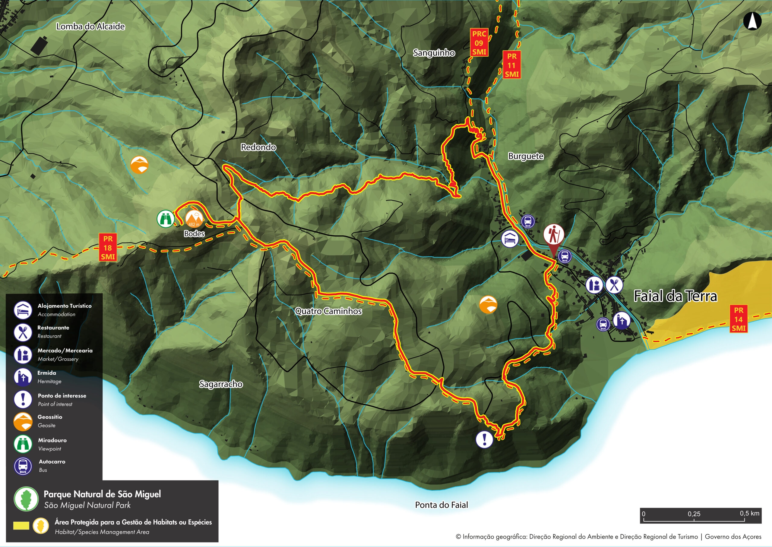 Gehen Sie die Straße hinunter, die sich über Kopfsteinpflaster schlängelt, wobei Sie aufgrund des rutschigen Bodens und des Gefälles vorsichtig sein müssen, bis Sie den Bach erreichen und danach die Straße bis zur Haupttafel, wo der Weg endet. Hier gibt es die Möglichkeit, über PRC 40 SMI – Quatro Caminhos do Faial da Terra, PRC 09 SMI – Sanguinho und PR 11 SMI – Ribeira do Faial da Terra Anschluss an andere Punkte der Insel zu finden.