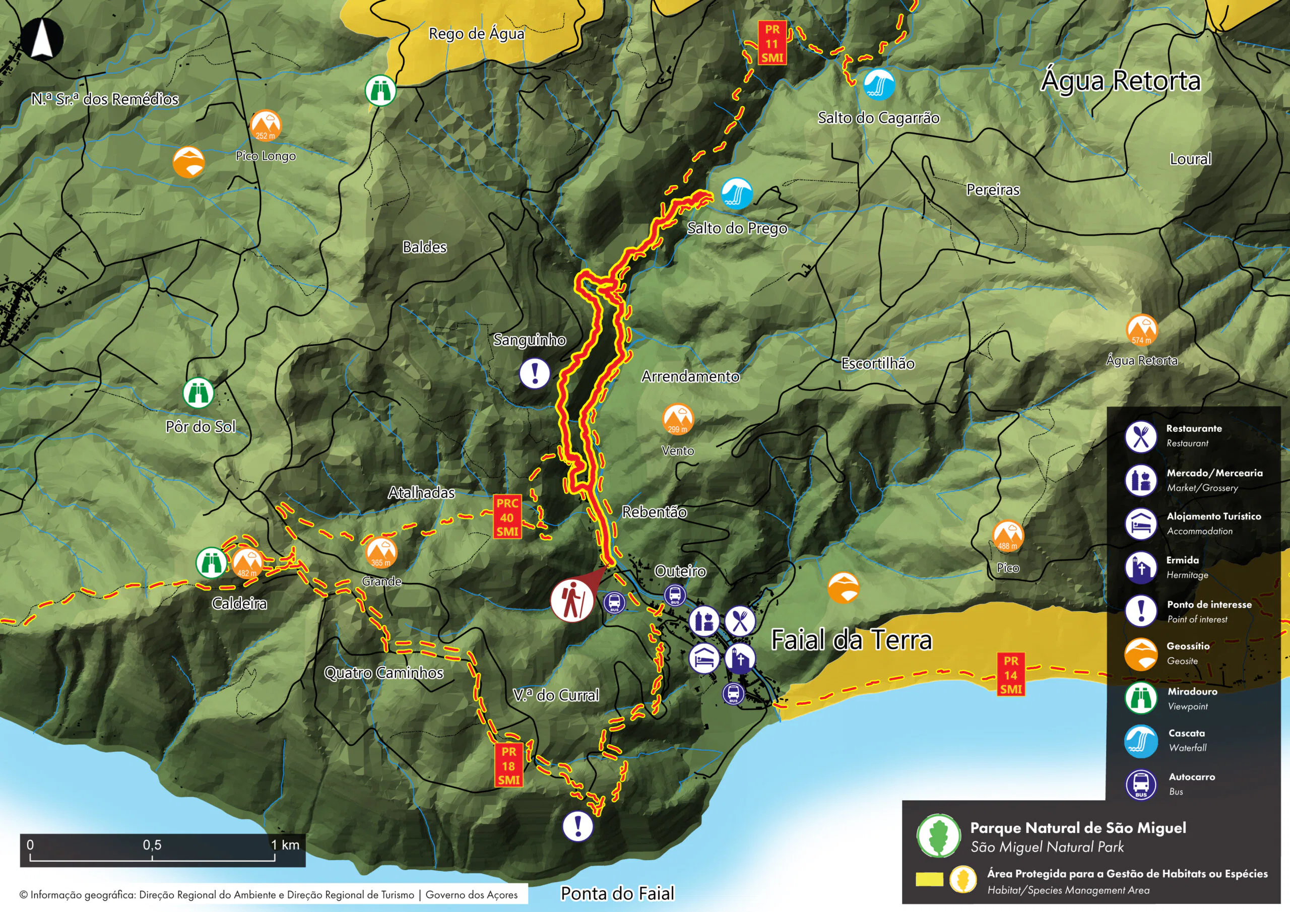 Wenn Sie die Brücke über den Fluss erreicht haben, überqueren Sie diese und gehen bergauf bis zu einer Weggabelung, an der Sie nach rechts in Richtung des Wasserfalls Salto do Prego abbiegen. Folgen Sie den Markierungen, vorbei an einer weiteren Abzweigung, die diese Route mit dem Wanderweg PR 11 SMI Ribeira do Faial da Terra verbindet, bis zum Wasserfall.